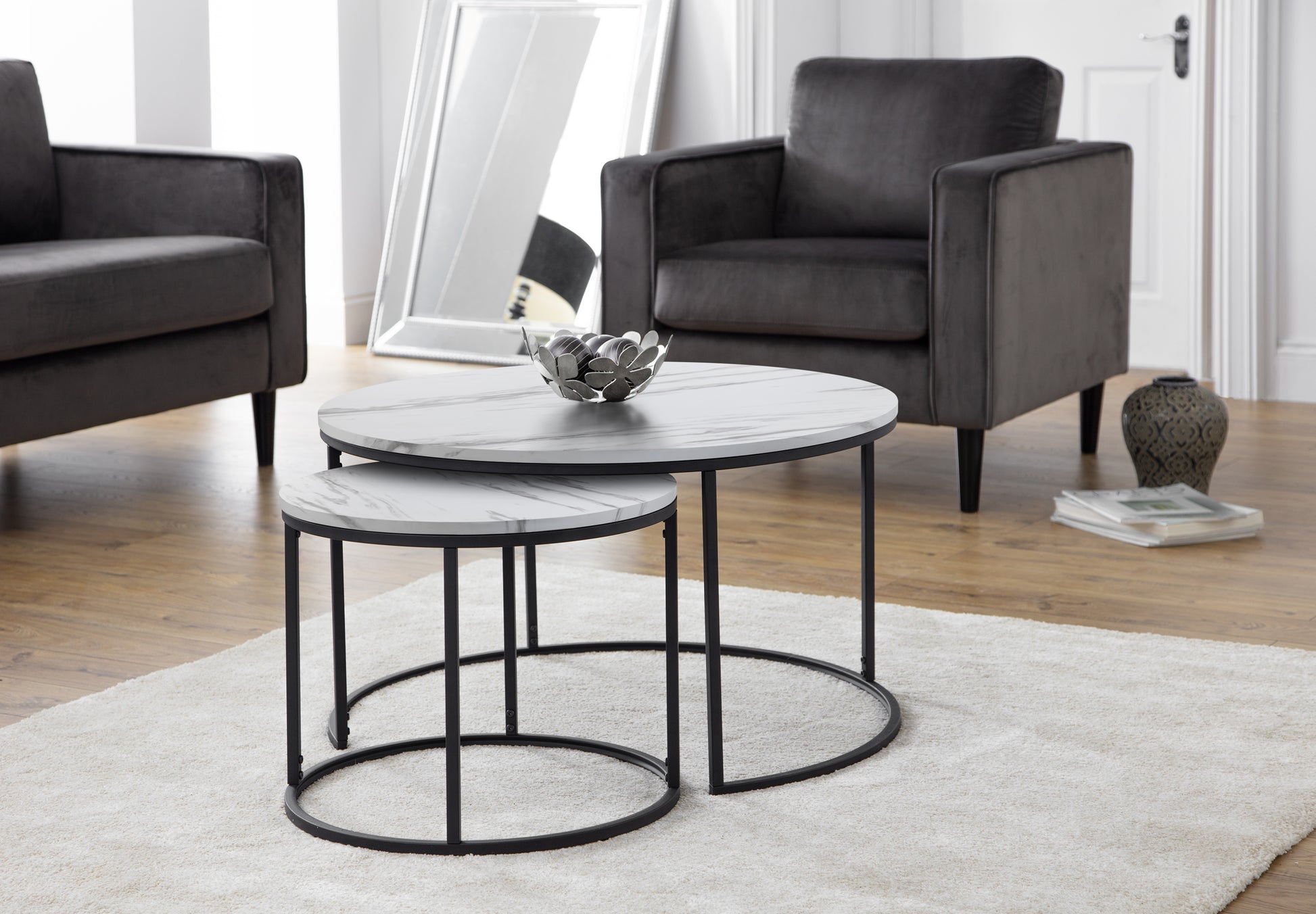 The Bellini Round Nesting Coffee Table ensures long lasting durability, crafted from black coated metal and MDF in an white marble foil finish. This set of two coffee tables boast a contemporary, stylish design with an industrial feel. Ensuring a space saving solution, the coffee tables slot together as and when they are in use.