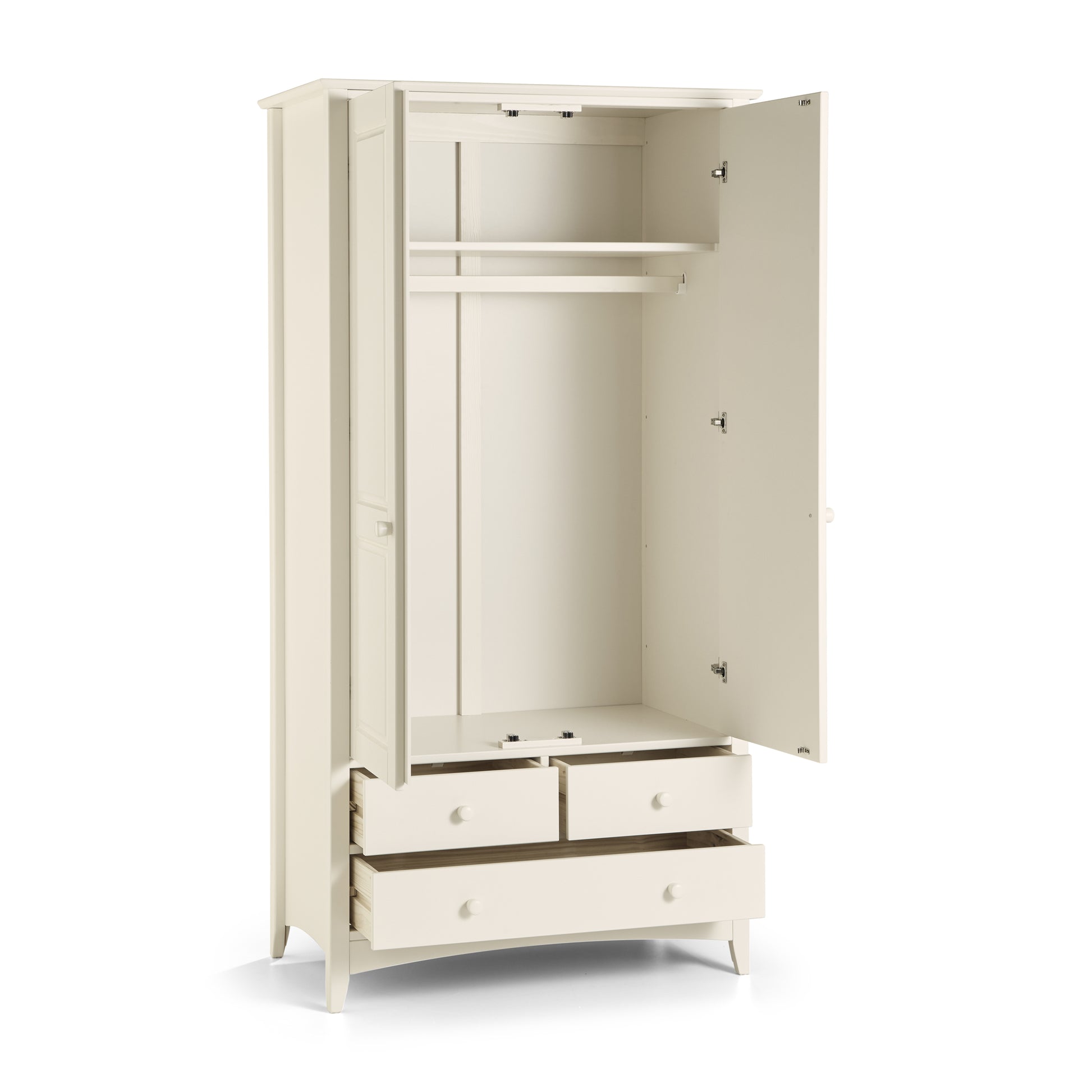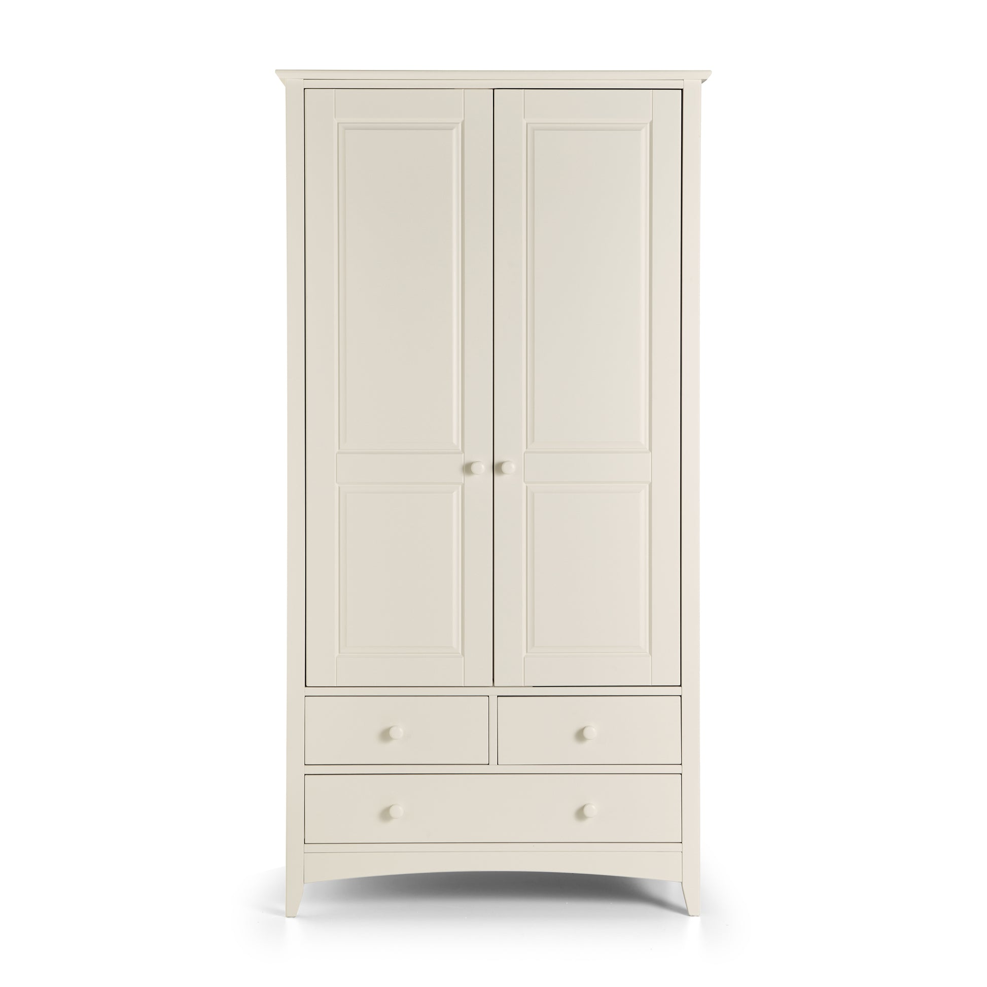Cameo is a beautiful stone white lacquered bedroom range. Its timeless shaker design is the perfect accompaniment to any interior style and is perfect for grown-up bedrooms and children's bedrooms alike. Solid pine frames ensure a sturdy and durable construction.The Cameo combination wardrobe has 2 doors and 3 drawers. The wardrobe also includes an internal shelf above the hanging rail.