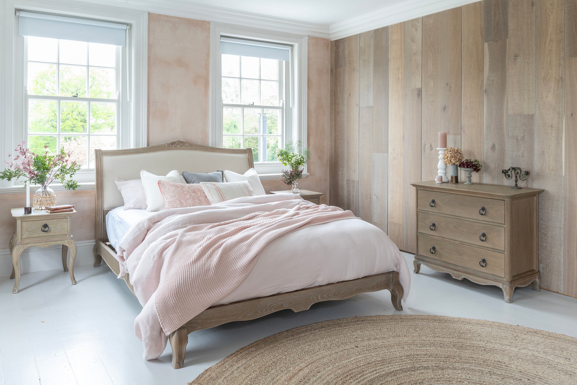 The Camille bed is a luxurious choice for any bedroom, blending romantic elegance with unmatched quality. Crafted from solid oak and oak veneers in a stunning limed finish, this piece exudes warmth and sophistication. The bed features a natural linen fabric upholstery, enhancing its soft, classic appeal.