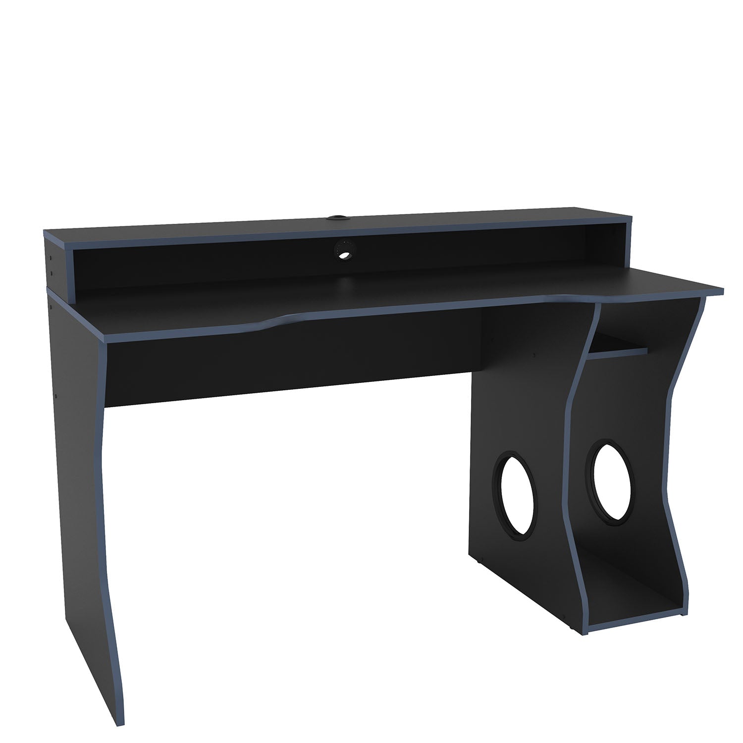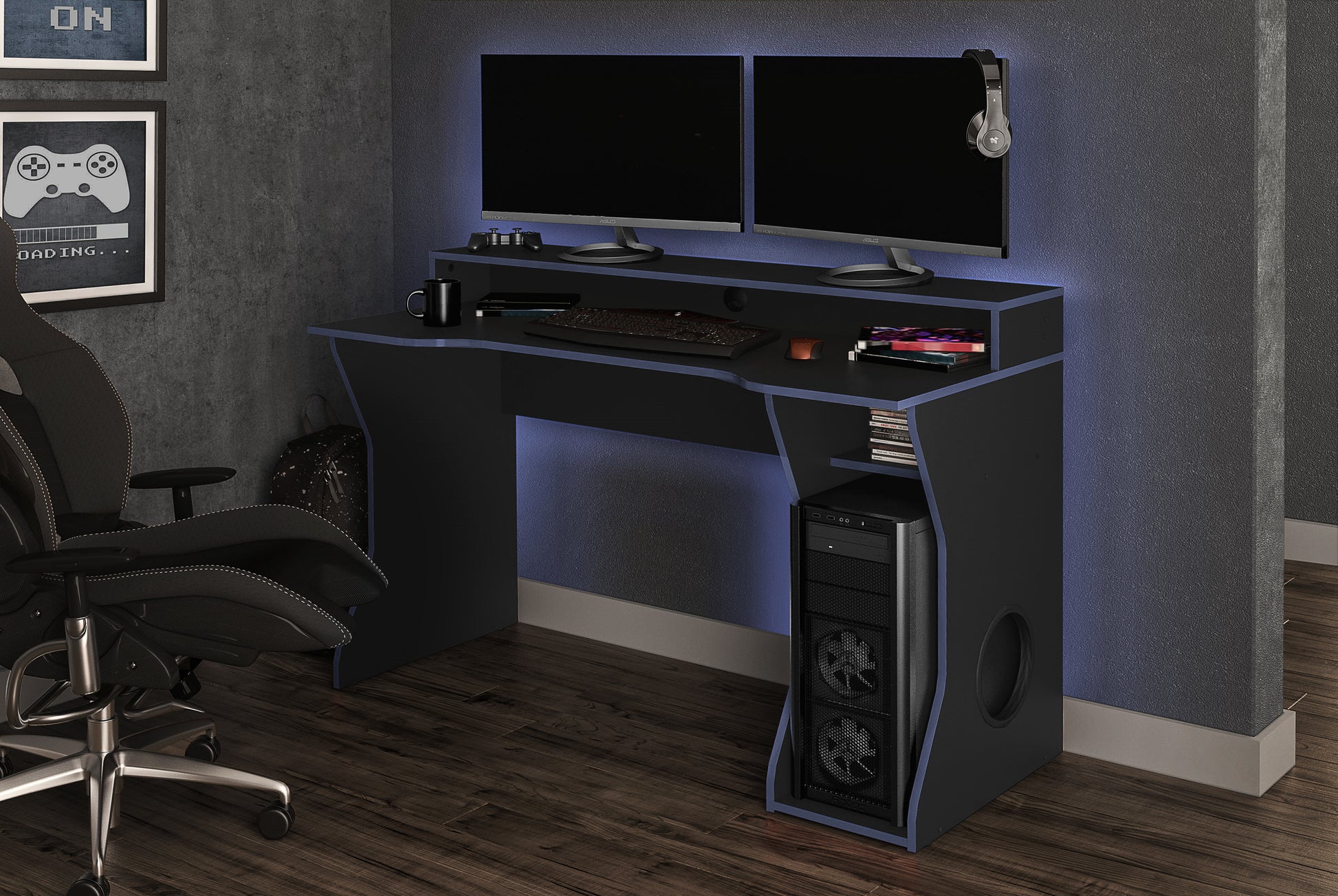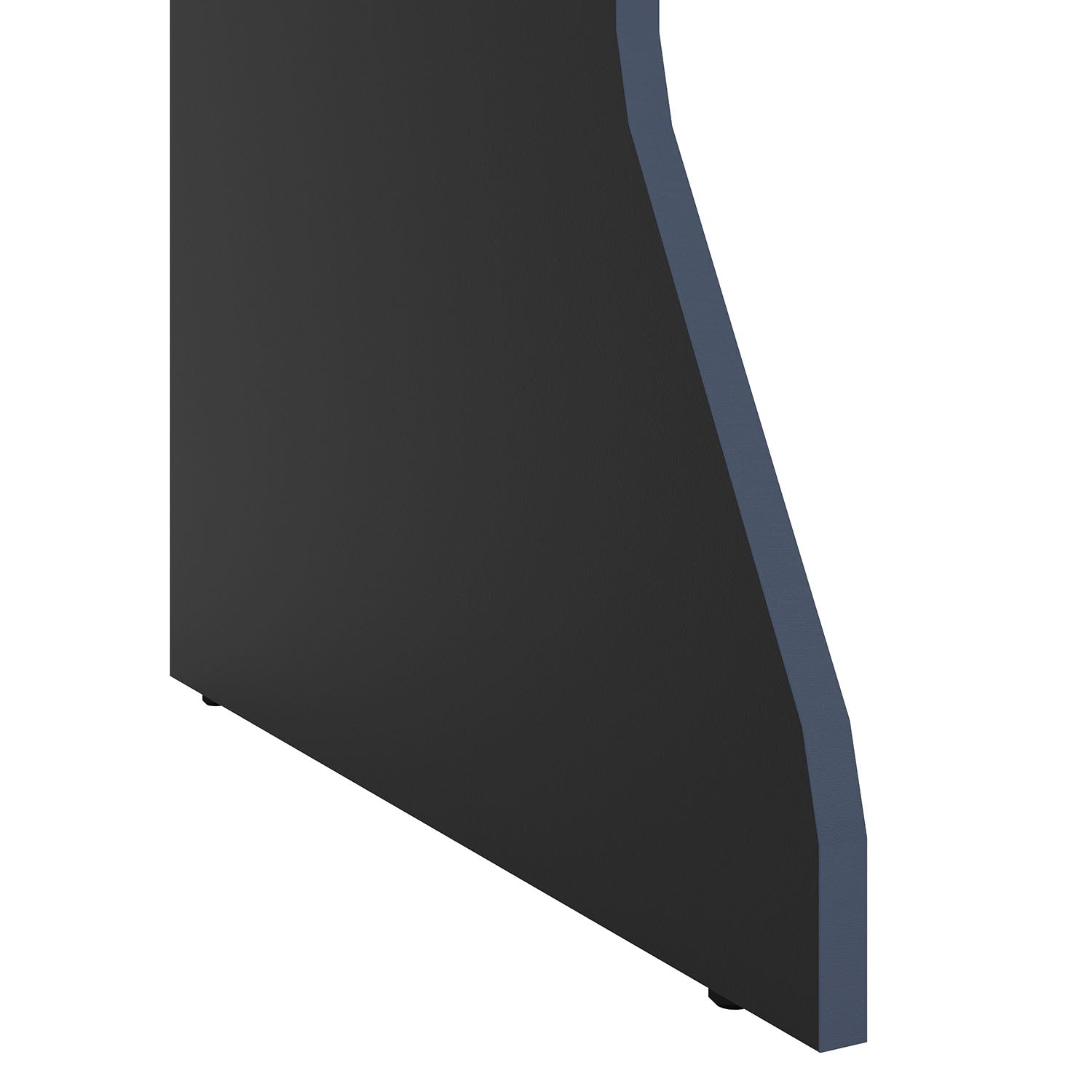 The Enzo gaming computer desk has been made with gamers fully in mind! It has everything a busy gamer could need. Featuring a large top shelf big enough for two large monitors and a generously sized ergonomic desk below suitable for the keyboard, mouse, controllers, games and more. The base of the desk features a computer store away with a ventilation hole and small shelf for games or controllers. This modern looking gaming computer desk is finished in black with a dark blue trim making it a stunning addition to any home or office. Care instructions: Wipe carefully with a soft, dry cloth.