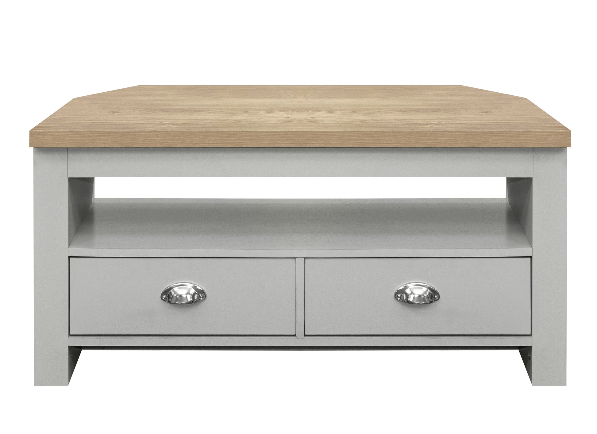 A beautiful addition to any room in your home, this Highgate Corner TV Unit is the perfect TV stand. Featuring a large shelf for entertainment units as well as 2 large storage drawers which are finished off with silver handles.